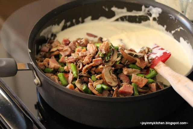 Asparagus season is passed here in Upstate NY, but we're smack in the middle of summer squash season. This sounded like it would work well for a zucchini lasagne variation. I julienned several large zucchini both green and yellow,then sauteed the strips in a little butter with the mushrooms, and added 2.5 cups of diced leftover ham, cooking until heated through.