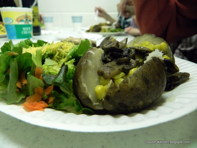 Our small group decided on baked potatoes with shredded BBQ chicken & all the toppings… they were a hit.